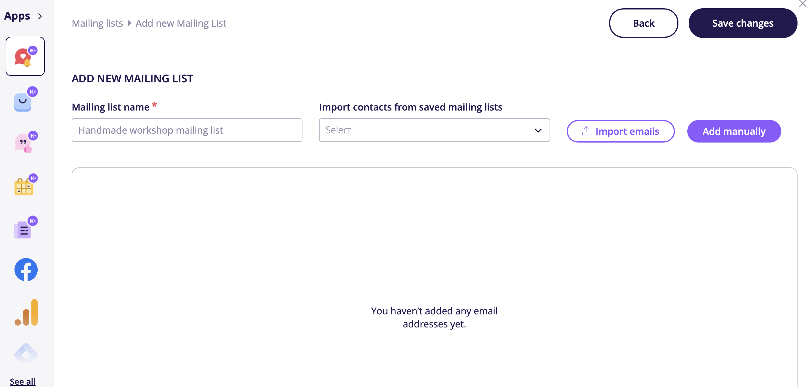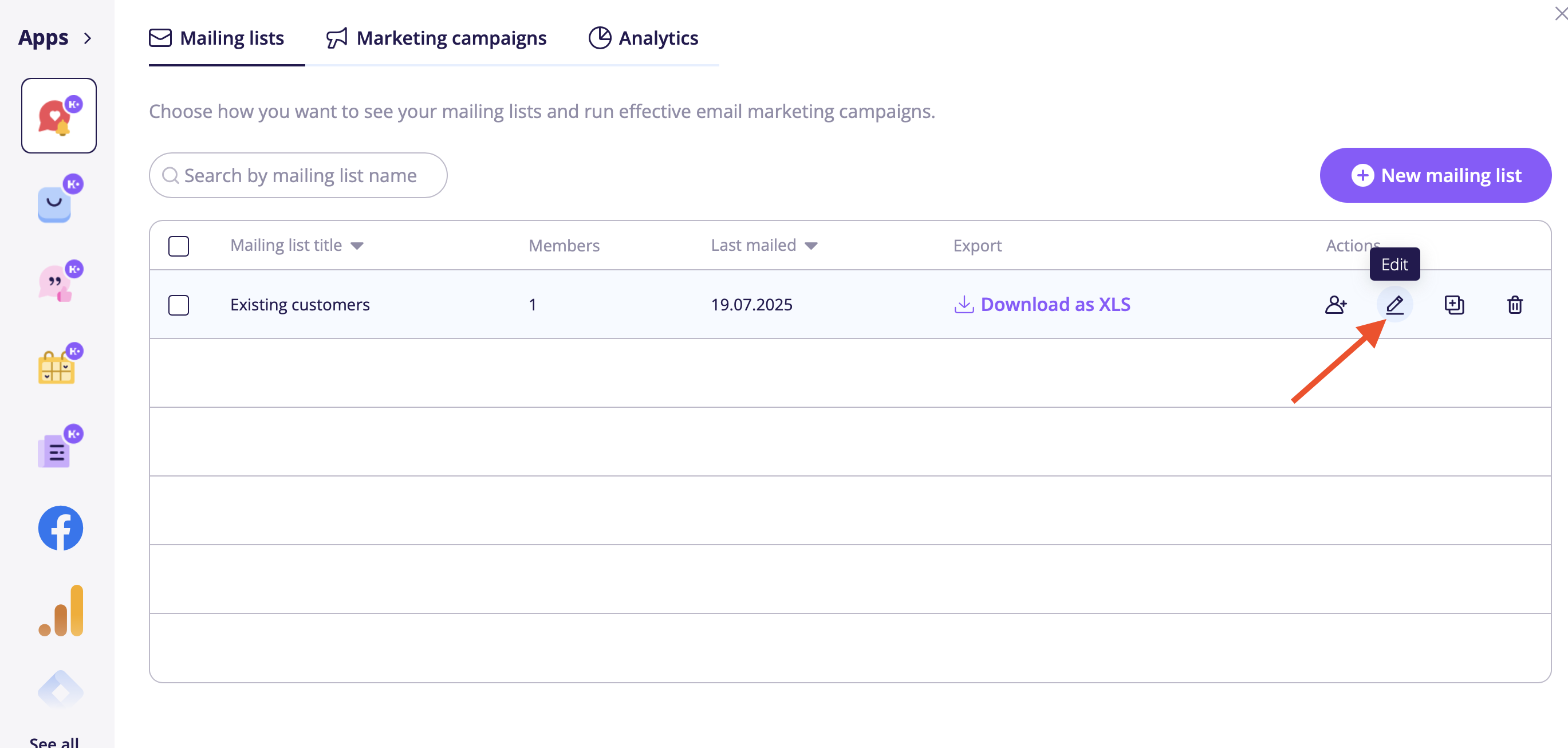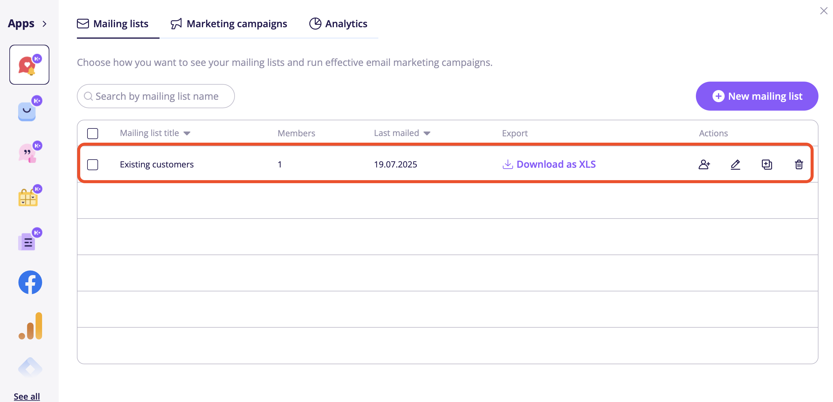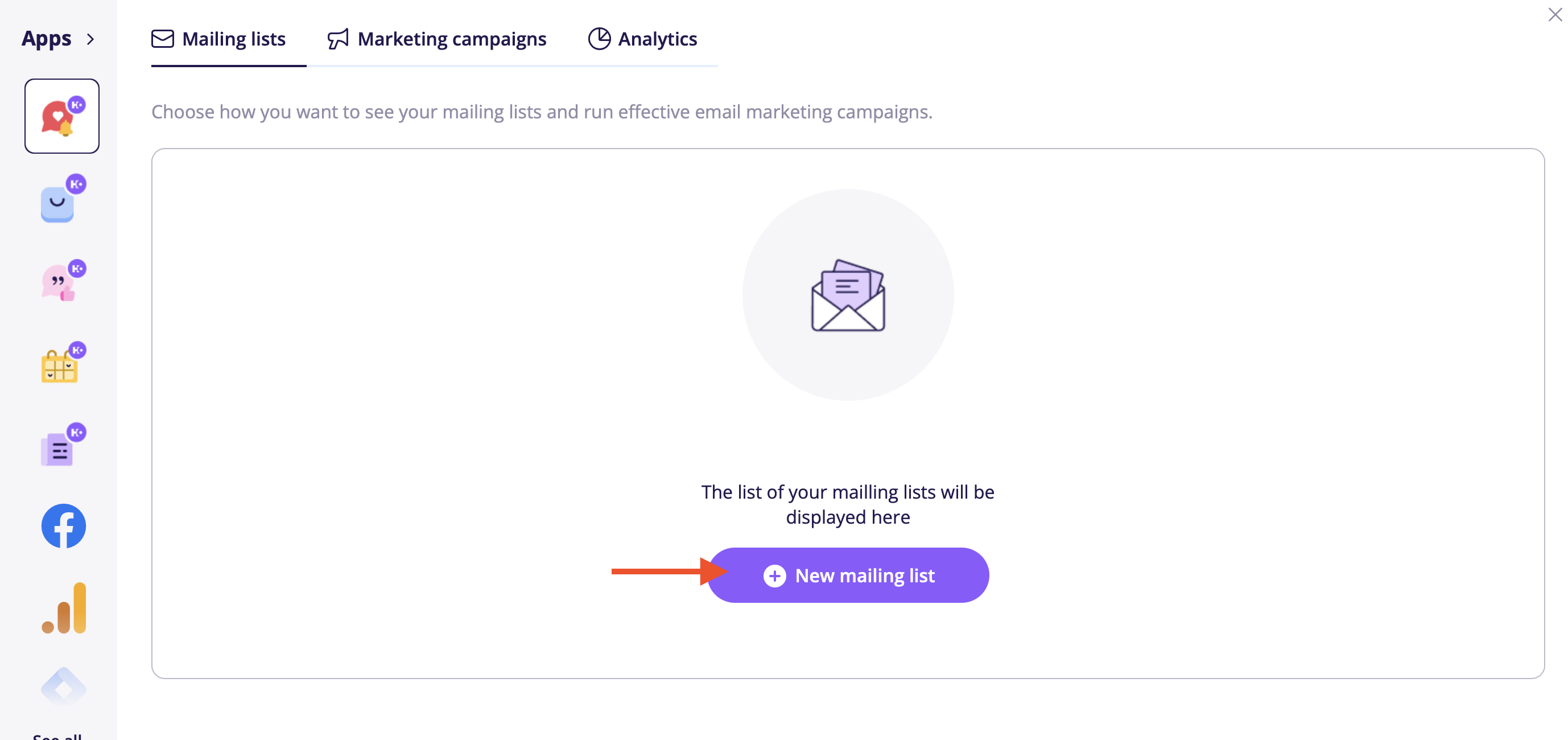 3. In the Mailing list tab, click on "New mailing list" to get started.