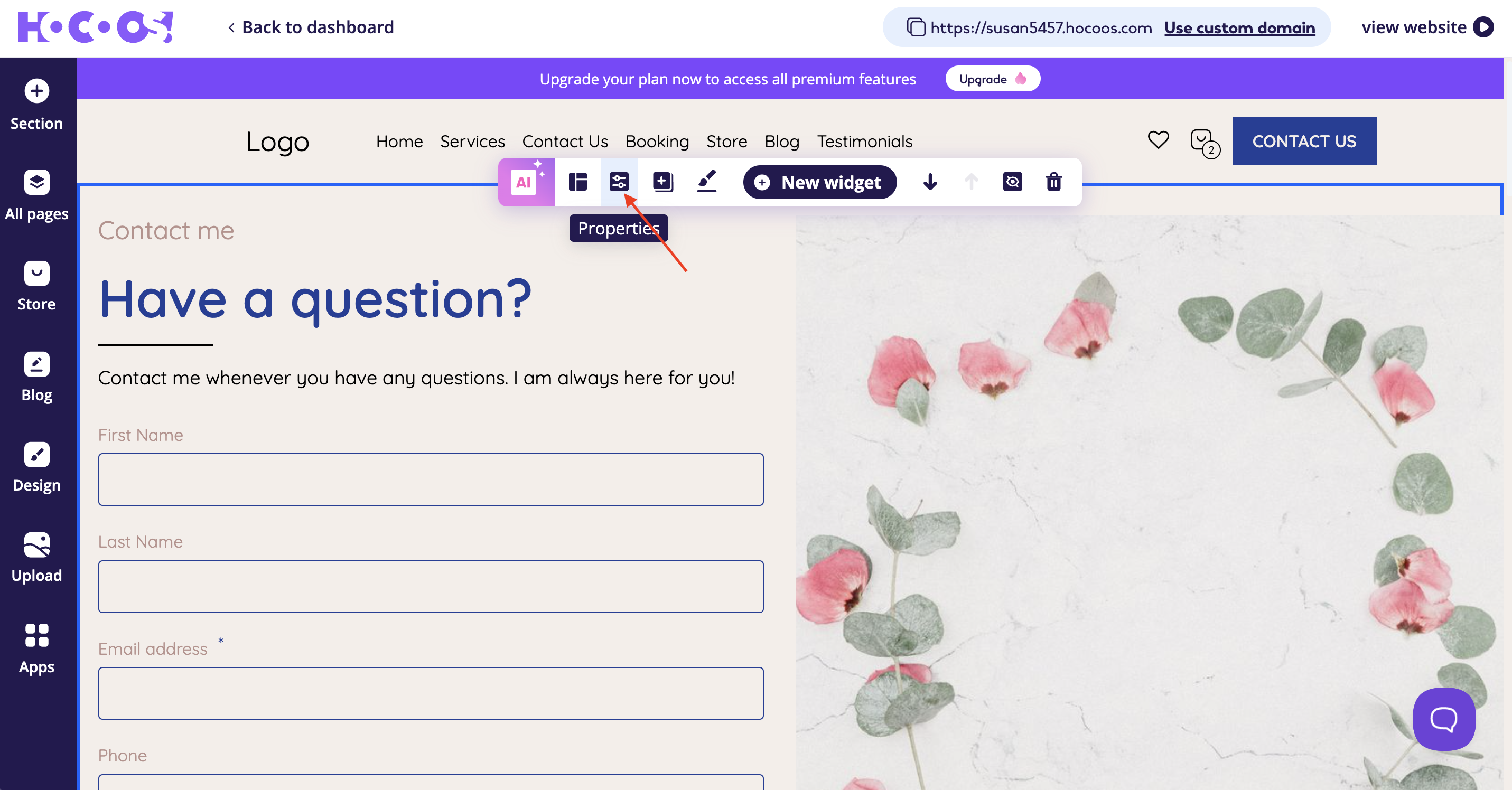 The Properties button is crucial, as it holds the main features for your Contact form: