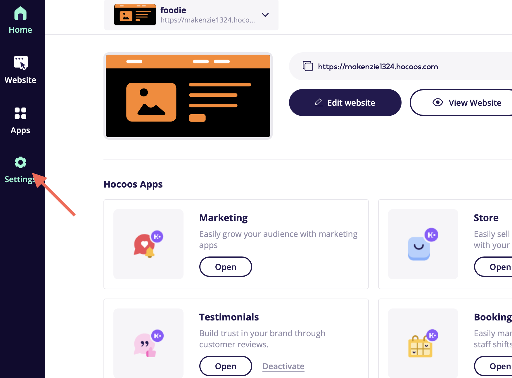 - In the Hocoos Dashboard, go to the Settings section.