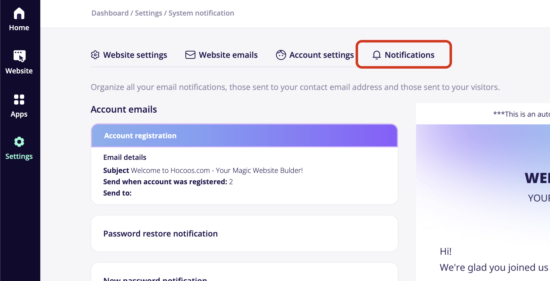 System notifications serve as a valuable communication tool, helping you stay informed and manage your account the best way possible. Hocoos boosts your company's efficiency with system notifications settings. Streamline information sharing by assigning specific areas to responsible individuals.