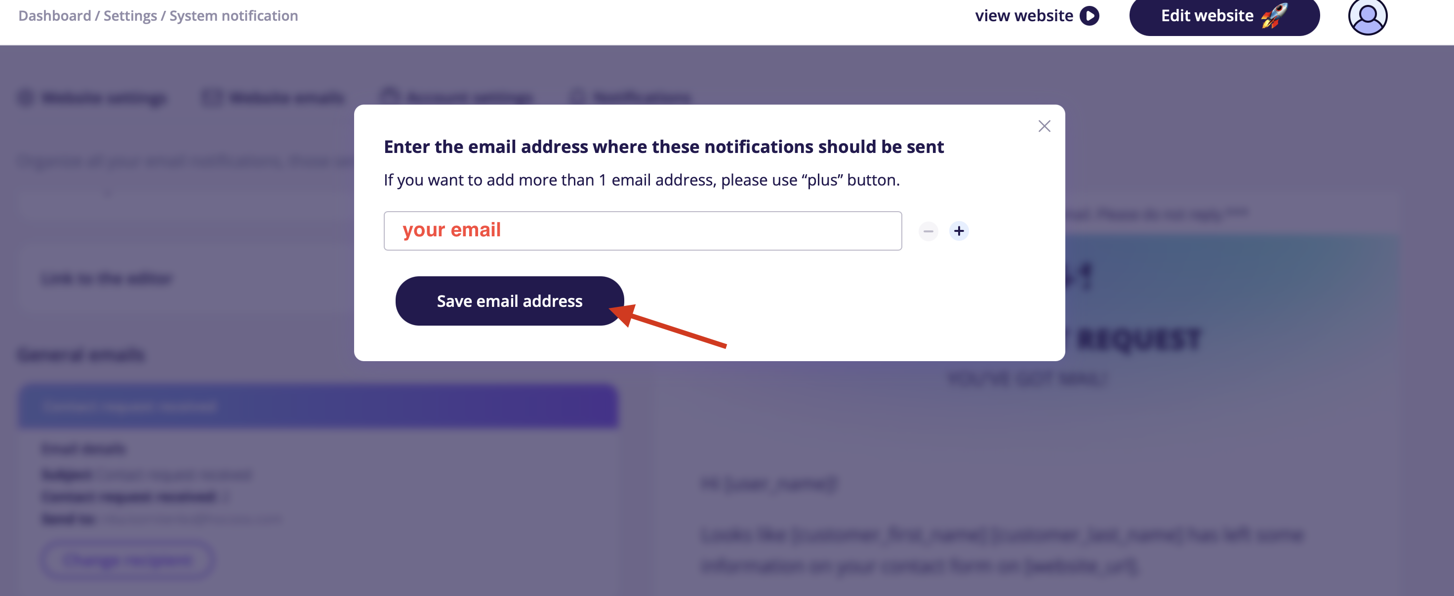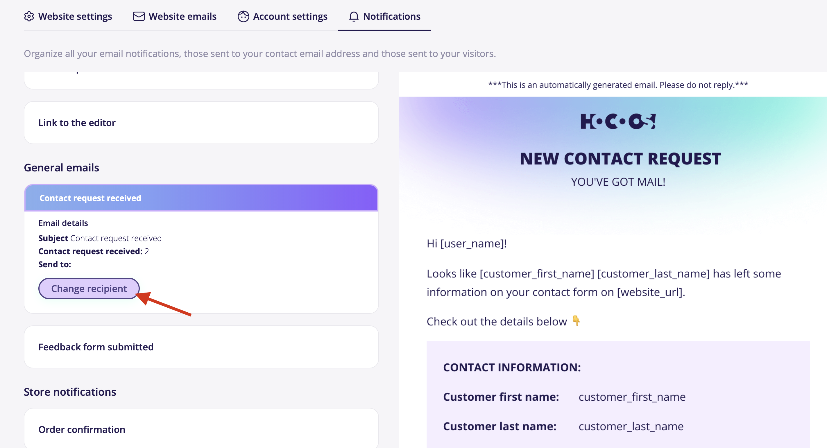- Locate the General emails block and click on the Contact request received subsection.