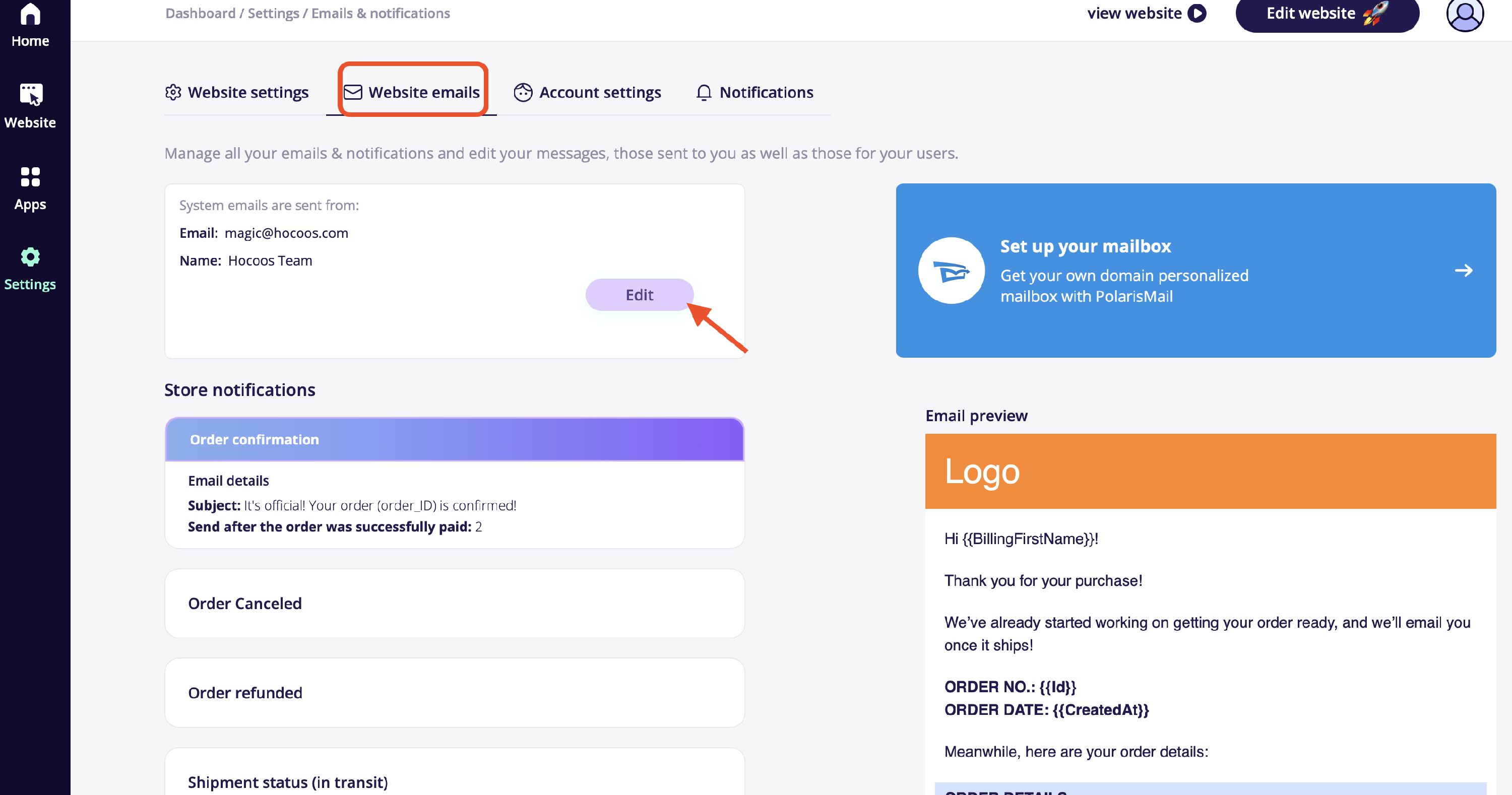 Go to the Settings tab in your Dashboard, then select Website Emails.